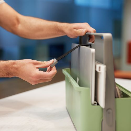 Einfach mitzunehmen und seine eigenen Sachen immer griffbereit zu haben. Egal ob Firmenlaptop oder sein Notizbuch, Stifte und Co. Perfekt auch für Sharing Arbeitsplätze wie bei uns im Büro.