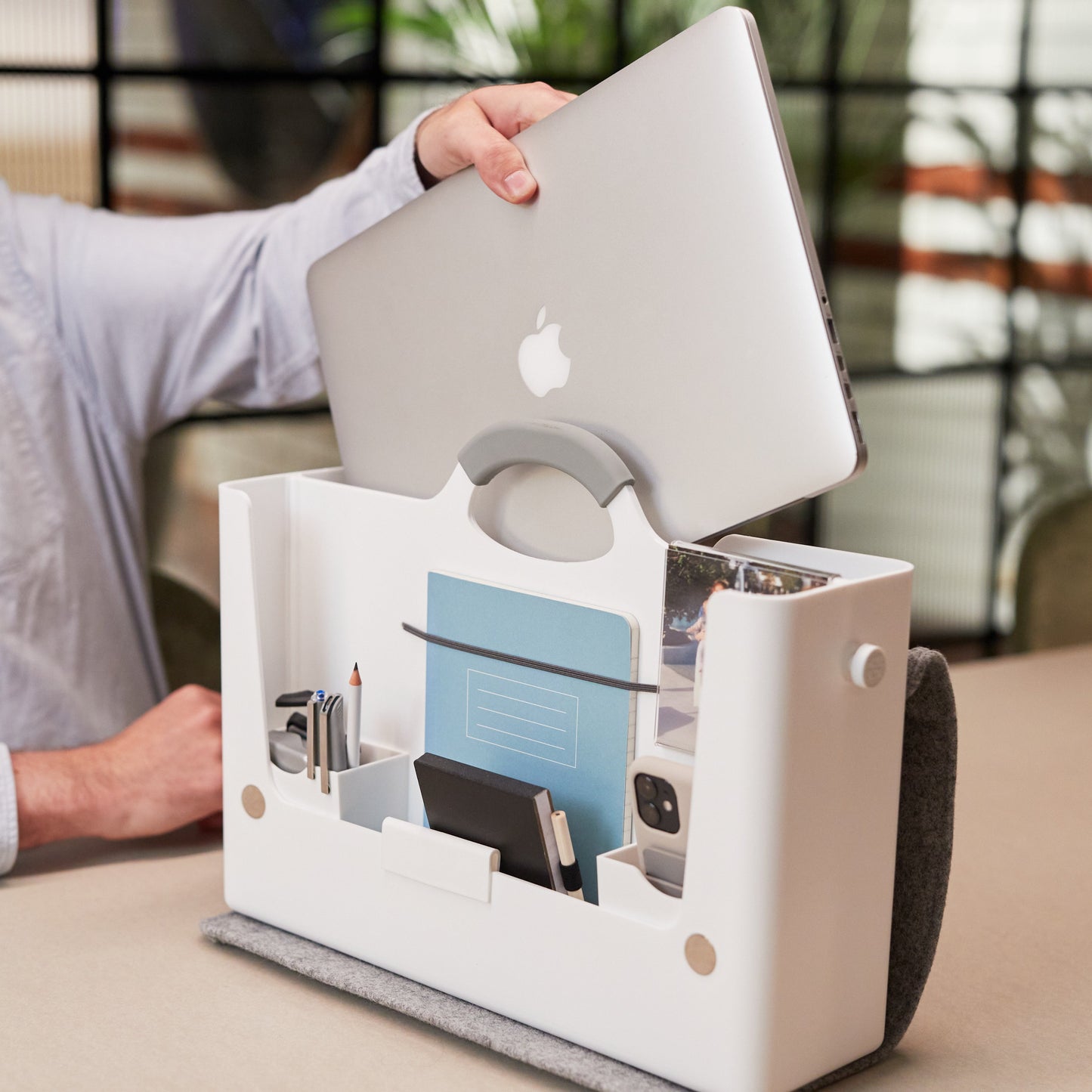 Einfach mitzunehmen und seine eigenen Sachen immer griffbereit zu haben. Egal ob Firmenlaptop oder sein Notizbuch, Stifte und Co. Perfekt auch für Sharing Arbeitsplätze wie bei uns im Büro.