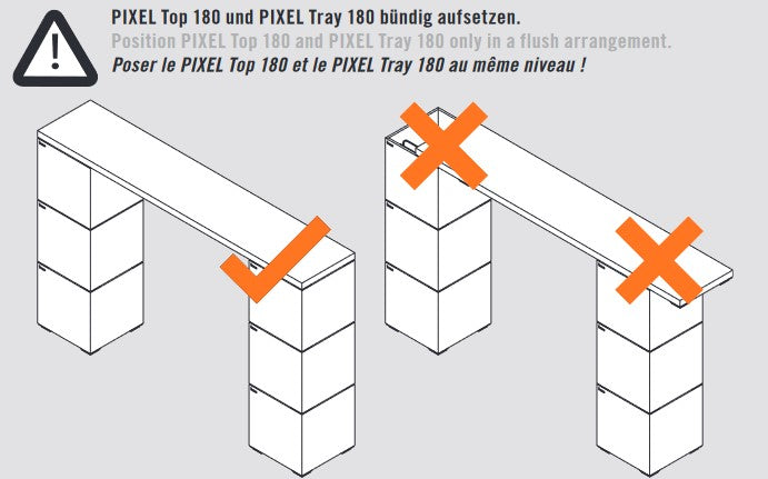 PIXEL Tops 180 und PIXEL Trays 180 müssen bündig nebeneinander liegen – sonst kann das Setting instabil werden.