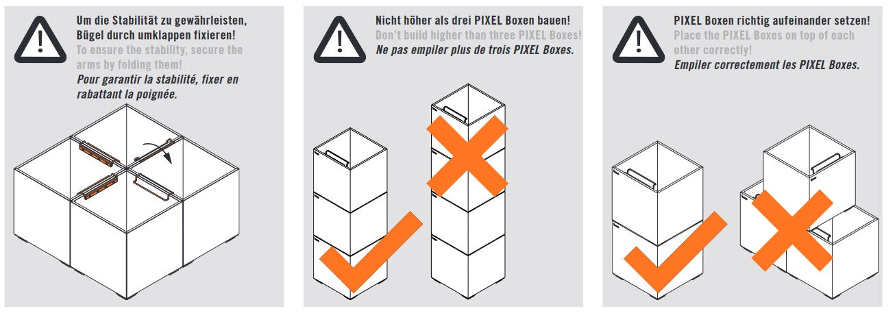 - Nicht höher als drei PIXEL Boxen übereinander stapeln.